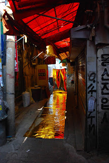 There are always more than two sides in a mirrors reflective performance. The reflected image itself, in its personified perfection, and the residual effects of light, shadow, and form that are cast off indiscriminately, at times revealing the unexpected. Our work in Saewoon market set out to do just that; capturing an unexpected time in a neighborhood becoming extinct; our method of making record and highlighting what we are unlikely to see at first glance. Boris and I experiment with reflective film. It is light weight and flexible, allowing for variable position and arrangement quickly. Our actions to line the streets with the reflective material are spontaneous and fast, as late afternoon sun transforms the narrow alley passages. Light is bent, refracted, saturated in diffuse color. Diluted in canopy time and adapted for today - the aging industrial base of Saewoon market (and other industrial districts around Seoul), nearly forgotten in tucked away urban positions behind the new front of progressive activity. For the cities residents today, it has become easy to forget the past in Seoul.